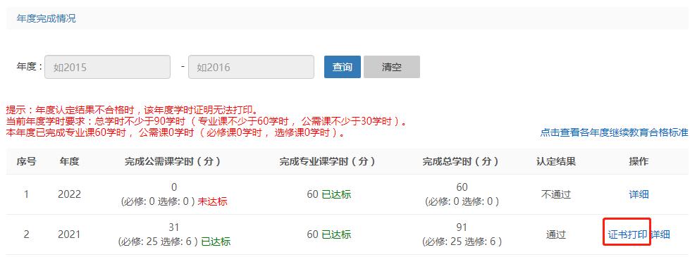 公需课与专业课都达到学时要求,显示通过年度继续教育,即可打印证书。